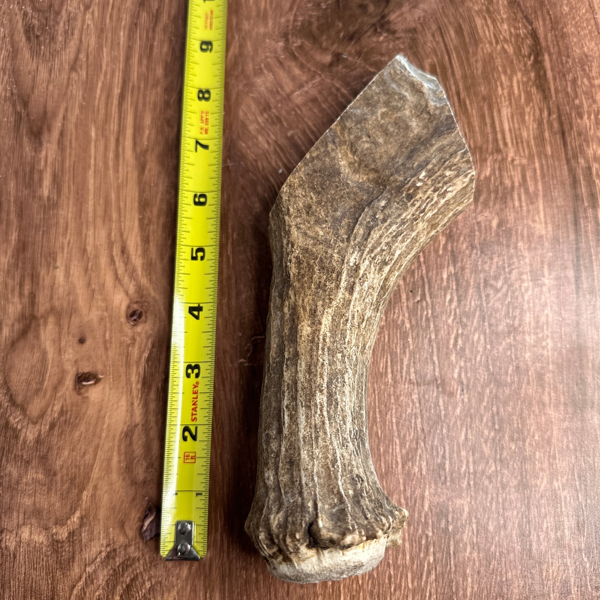 Extra dense moose antler base (burr + beam) sold individually. This piece measures 8 inches and weighs 1.11 pounds, offering a solid, workable section ideal for flintknapping, pressure flaking billets, carving tools, and rugged handle projects.